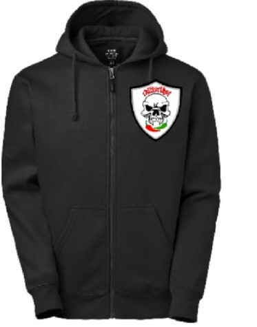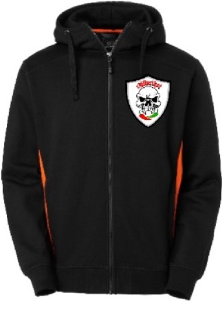 Collegetakki, jossa harjattu sisäpinta ja tehosteväriset sivupaneelit. Edessä kaksia vetoketjutaskua.